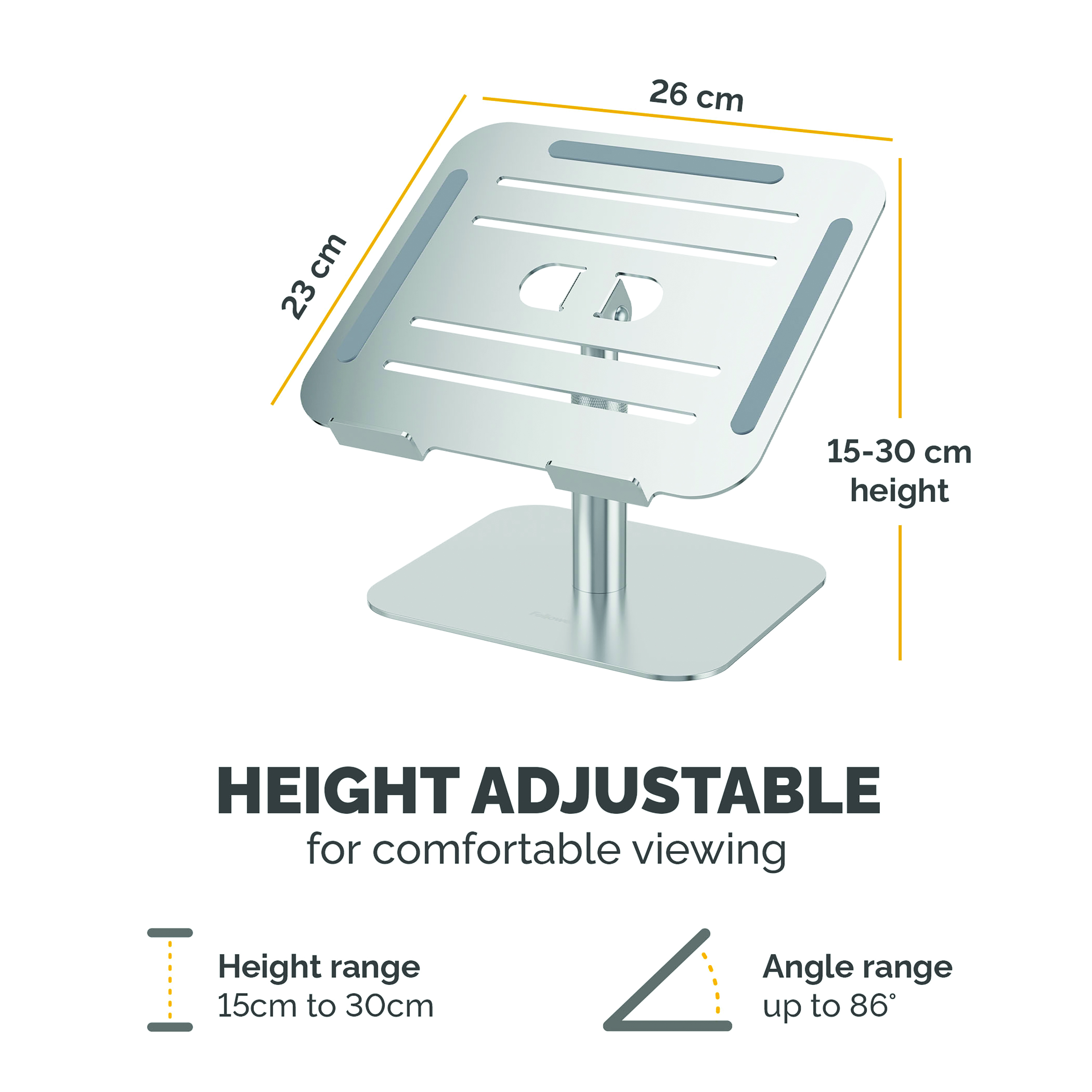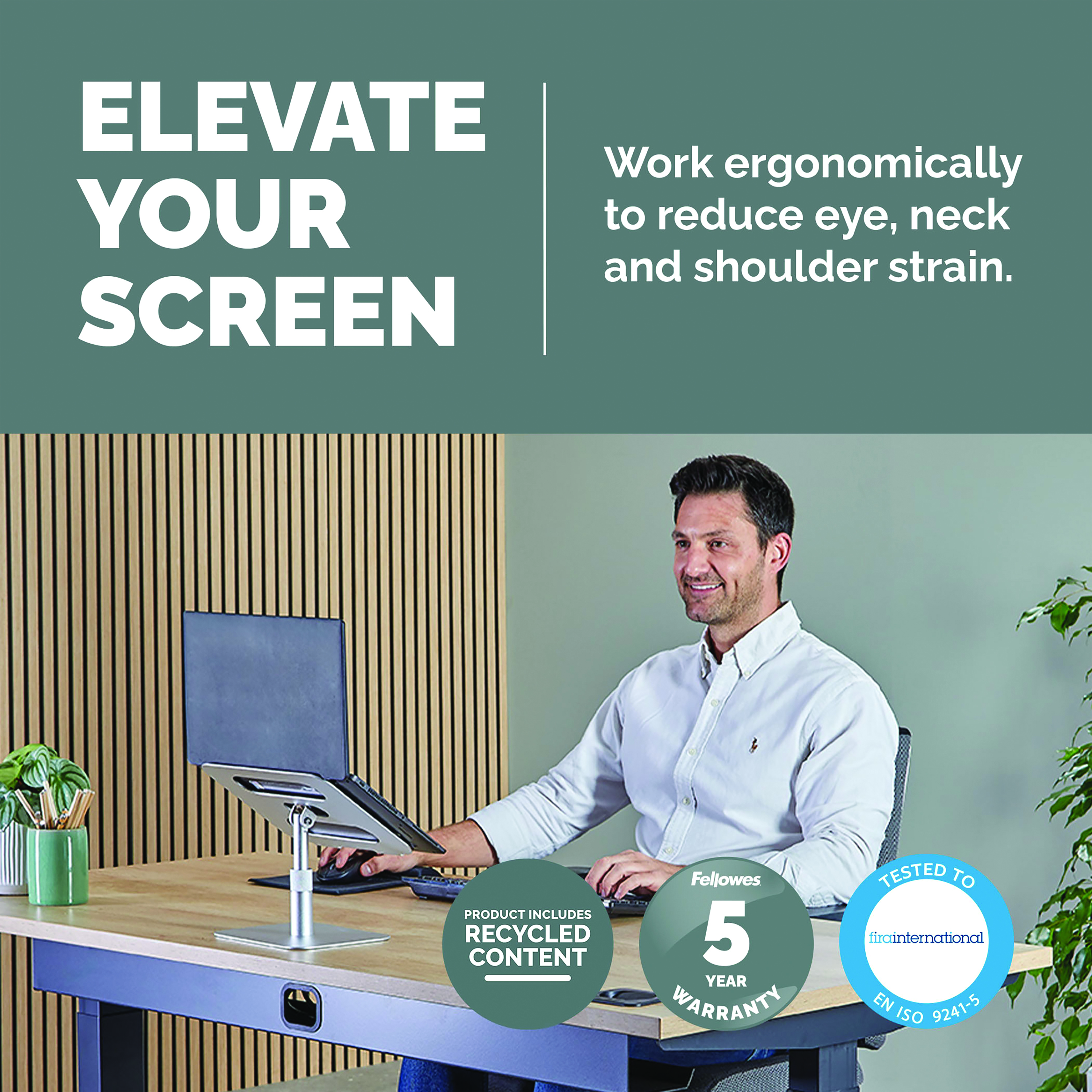 The Fellowes Alumia Desk Based Laptop Stand is designed to help minimise discomfort in your workspace by elevating your laptop to a more ergonomically correct viewing position, reducing neck and eye strain. It supports laptops up to 5kg in weight and screen sizes up to 15 inches. With up to 15cm of easy height adjustments (15-30cm) it promotes good posture and all-day comfort. The compact design makes it perfect for small workspaces. The platform is tilt adjustable allowing you to optimise your screen positioning, ideal for restricted opening laptops/MacBooks, while the open design enhances air circulation to help keep your device cool.